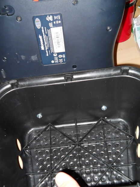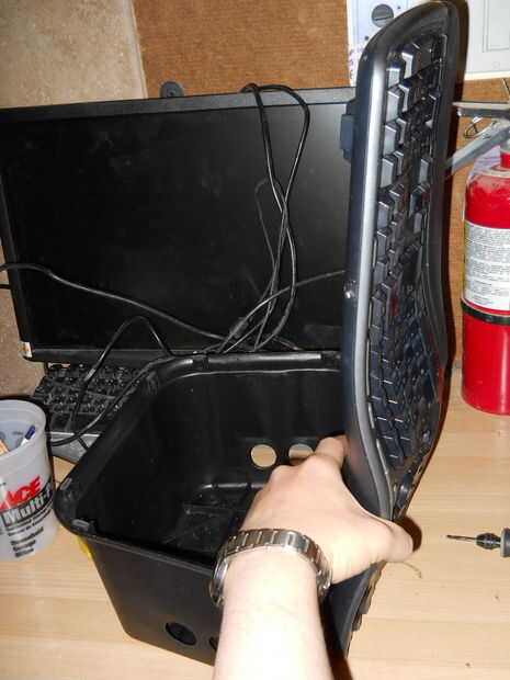 Debe trabajar sobre una superficie plana como una tabla. Tomar el primer envase y conecte la parte más grande del teclado. Comprobar la estabilidad. Probablemente el teclado será demasiado pesado, por lo que este problema se solucionará en el siguiente paso.