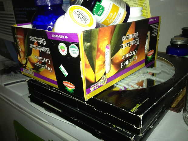 De búsqueda su papelera de reciclaje, armario o callejón! Utilizamos una caja de mandarinas, una caja de pañuelos y algunos rollos de WC. Solo intenta pensar en lo que su uso de organizador e ir de allí.