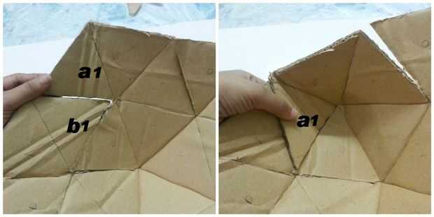 Para ser más claro, tener en cuenta el cuadro 5, donde me he doblado el triángulo a1 marcado sobre el b1 marcado triángulo y pegado, pegar del mismo modo el resto de los triángulos (a2 en b2, a3 sobre b3, a4 sobre b4 y a5 sobre b5).
