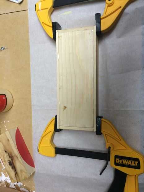 el motivo de la Junta en el centro es mantener la caja cuadrada por la seca de pegamento si pones cinta de embalaje en el tablero en el centro es easer mucho para poner hacia fuera porque el squees pegamento hacia fuera no se pegan a la cinta. Usé sólo 2 abrazaderas y déjelo reposar dos horas estar para sacar las pinzas y poner abajo en usted también puede usar gomas si no tiene campos o están haciendo muchos de ellos