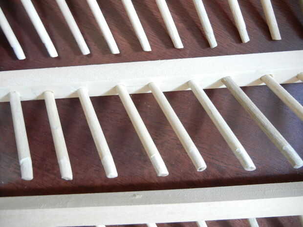 En cada orificio que ha perforado Coloque una gota de pegamento para madera y luego inserte 3" pieza de espiga. En un extremo de la cola cuadrada vertical 1/2" pieza de espigas y en el otro extremo pegar una 1 1/2" pieza. Si coloca los tacos en un ligero ángulo (como hice yo) Asegúrese de que el 1 1/2" pieza se une a la parte superior de los rectos cuadrados con las 3" espigas en ángulo hacia arriba. Deje que el pegamento se seque.