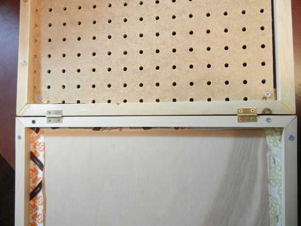 Cuelgue los organizadores en su pared. Terminé añadiendo un par de soportes en L para ayudar a asegurar mi organizadores a la pared por lo que no podía inclinar mientras está en uso. Dependiendo de su sistema de suspensión puede o no necesitarlos. Sólo asegúrese de que está seguro en la pared y no se mueve cuando la cubierta se hace pivotar abierta.