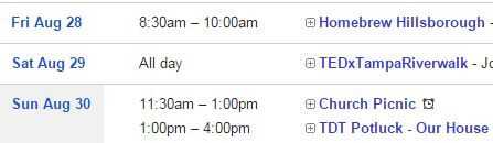 Ahora es bastante simplista. La lista anterior no detalla la naturaleza exacta de los centros comerciales el viernes y hojas de trabajo riguroso llevó a producir el evento de sábado de conjunto hasta romper, cena luego con el equipo del evento y un tardío regreso a casa. Y realmente no da ninguna penetración en la naturaleza de todas las interacciones curso el domingo entre dos grupos de personas en dos diferentes eventos, o sobre cómo tarde puede estar terminando algunas cosas durante el período ocupado.