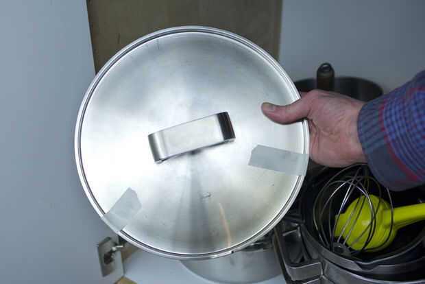 Poner marcadores cinta adhesiva alrededor del borde de la tapa de olla en el cuatro y las posiciones de la 8:00. Esto es donde los soportes de sugru sostenga la tapa de la olla en su lugar.