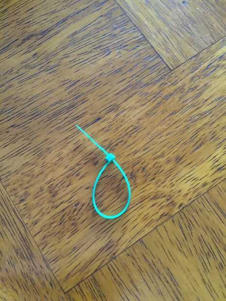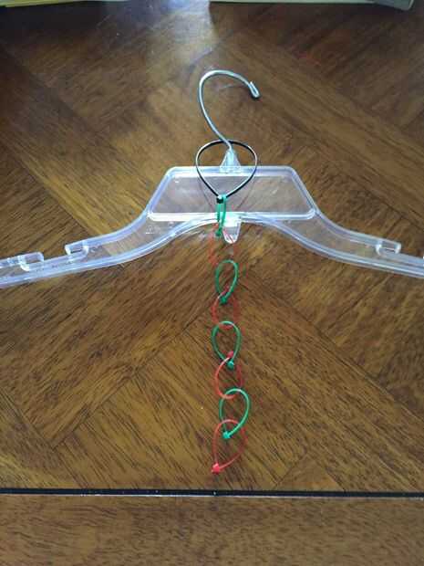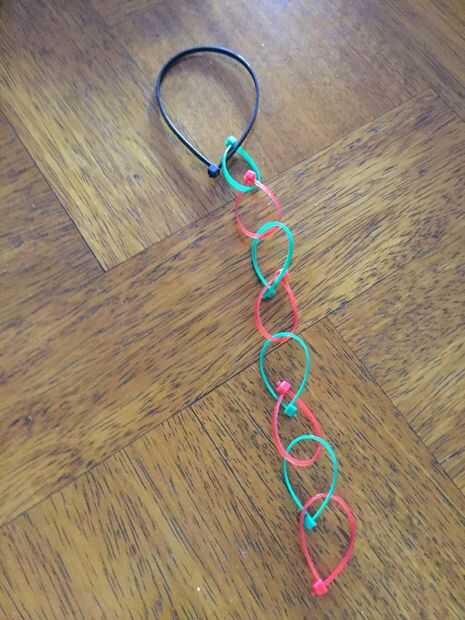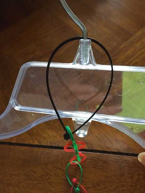 Una brida de 4 pulgadas y un círculo. Ahora sigue añadiendo lazos zip de 4 pulgadas para hacer una cadena. Se ha añadido una amarra de 8 pulgadas en la parte superior. Ahora cortar todos los lazos zip. Poner la cremallera más grande lazo alrededor de la percha. Ahora tienes una percha con una cadena de lazos zip. Esto es donde vas a combinar elementos para consolidar los elementos colgando en su armario.