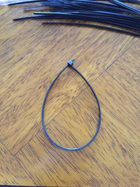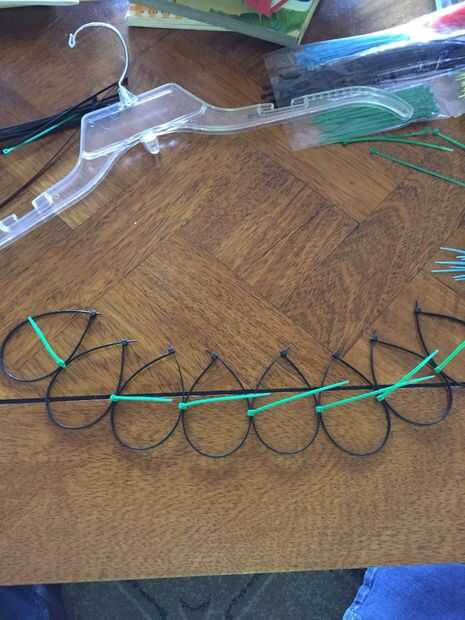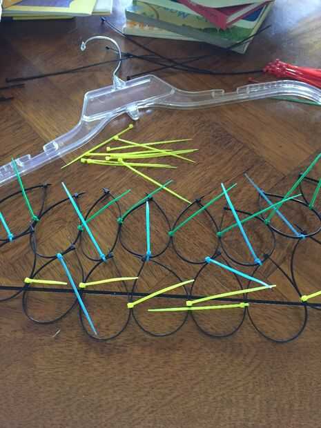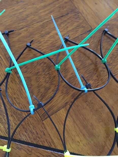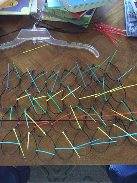 Comience con las ataduras de cremallera de 8 pulgadas. Hacer un círculo. Ahora hacer círculos más 31 fuera de los lazos de 8 pulgadas. Usted puede hacer más pero hice un gancho para sujetar 32 pañuelos. Ahora vas a colocar dos círculos con una brida pequeña. Hacer una cadena de 8 conectados juntos. Ahora hacer 3 filas más de 8 círculos. Ahora vas a combinar las filas junto con ataduras de cremallera pequeño. Por lo tanto debe tener 4 x 8 filas y columnas de ataduras de cremallera.