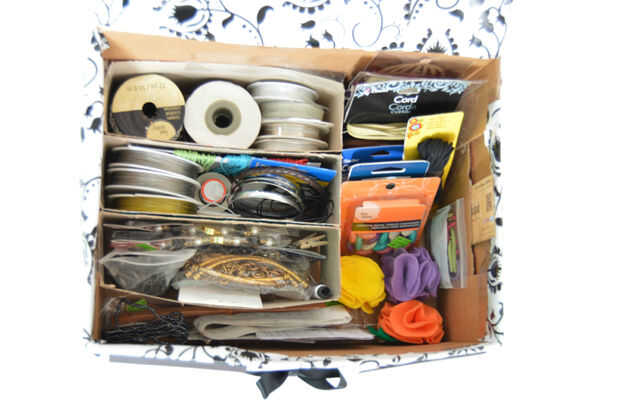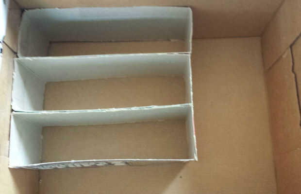 2) utilice cajas de cereales pequeñas y cortarlas horizontalmente para usar como separadores dentro de la caja. Use cinta y grapas para unir los divisores. Decidir los arreglos según lo deseado. Quería un espacio extras en los laterales por lo que no incluyo ningún divisores, si lo desea puede :)