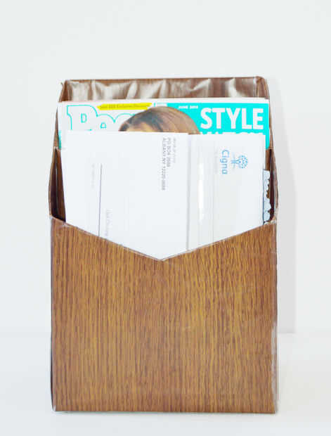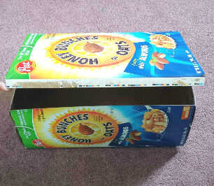 1) cierre la tapa con una cinta transparente y abrir la caja de cereal (tamaño grande) desde el lado que usted conseguirá una tapa para la caja. (Como se muestra)