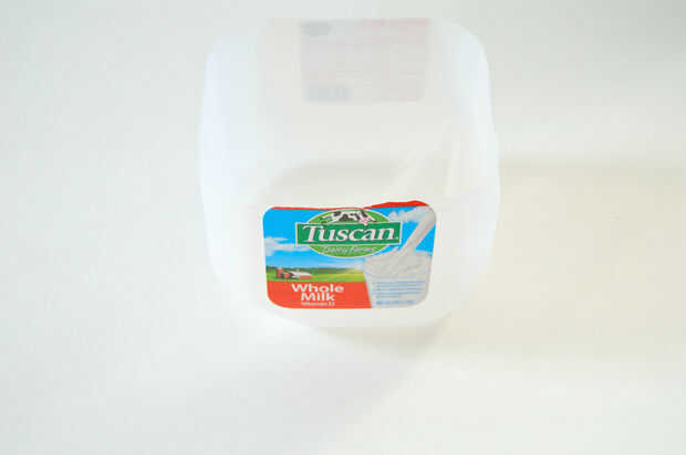 1) Lave y seque el jarro de leche. Las etiquetas engomadas de la peladura es opcional porque va a ser cubierto en cinta. Si no desea utilizar cinta, puede pelar las pegatinas. Estos son algunos consejos para pelar las pegatinas de plástico.