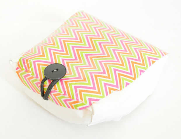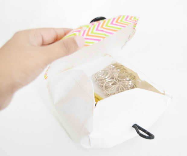 5) de la misma manera, haga un orificio de cierre en la parte inferior. Introducir el elástico y hacer un nudo para fijarla. Eso es todo!! Utilizar el elástico para cerrar el cuadro. Utilice la caja para almacenar suministros. Puede ser cualquier cosa, desde suministros de oficina a set de afeitado (sí chicos!!!!!! Hice uno de estos para mi hermano guardar sus cosas de afeitar.)
