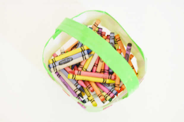 4) para agregar un mango, corte un pedazo largo de cinta desde la porción restante que cortamos en paso 2 y cubrir con cinta adhesiva y fije la cesta utilizando la grapadora.