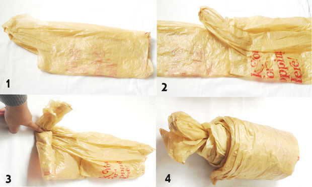 3) ahora comienzo roll la primera bolsa de tal manera dejando el mango para ir apareciendo fuera del rollo. (como se muestra y numerados como 3)