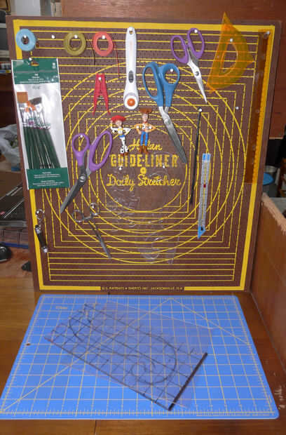 Alguien me dio una tabla de bloqueo vintage, que fue llamada una "camilla del tapete" en su embalaje. No hago mucho trabajo que requiere una tabla de bloqueo, así que la mayor parte del tiempo se queda inclinada por detrás de mi almohadilla de corte rotatorio. Cuelgo el cortador rotatorio en él, así como mis reglas de curva francesa, transportadores, pinzas de arte, tijeras, cintas de medir, calibres del cordón, pinturas, pinceles y Woody y Jessie de