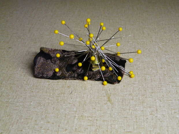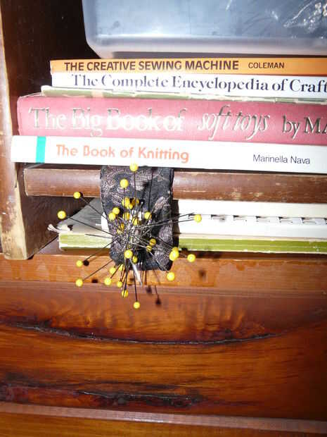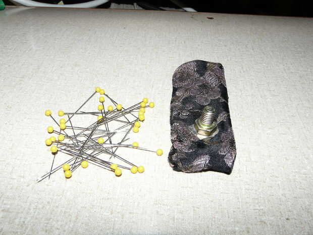 Si usted quisiera, se podrían usar un imán y un tornillo, pero hay varias razones por qué colocó en esta configuración. El pedazo plano de metal mantiene el alfiletero de pie vertical y hace más fácil recoger. La bolsa de tela mantiene las piezas de metal de rayar tu mesa y le permite conectar a una superficie horizontal, si lo desea. Conectar mina a la librería de al lado de mi máquina de coser atrapando la parte superior de la bolsa entre dos libros pesados. Si usted necesita llevarlo alrededor, sólo sacar entre los dos libros y llevarlo con usted. Incluso podría añadir un ojal para colgar en el pegboard.