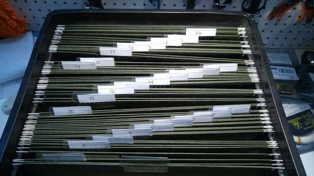 En cada carpeta coloqué una ficha de plástico dependiendo de las carpetas pueden ser capaces de poner en, o pueden ser parte de la misma carpeta. En cualquier caso, este es el lugar para colocar su Índice de la hoja de cálculo en el paso 2. Al poner esto allí, sabes exactamente dónde buscar para sus piezas. No hojeando de mirar nombres de carpetas.