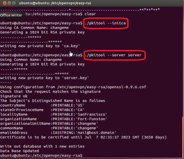 Ahora se crean las claves de servidor y certificados. A continuación, tenemos que el cliente las llaves y certificados.