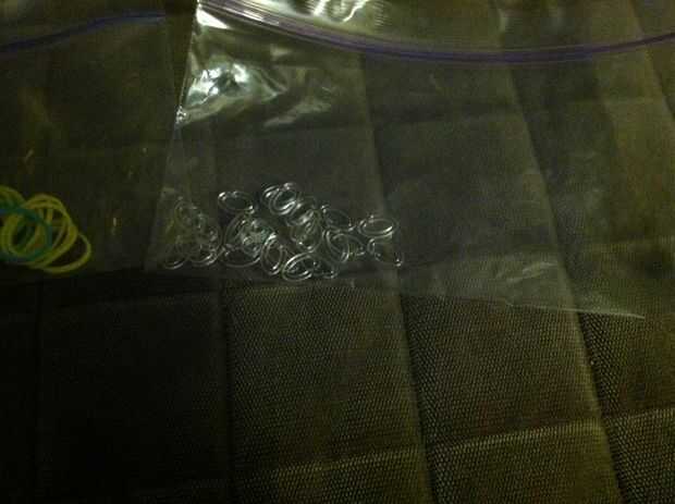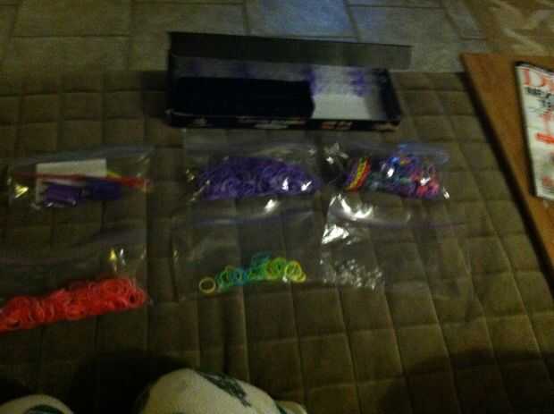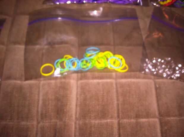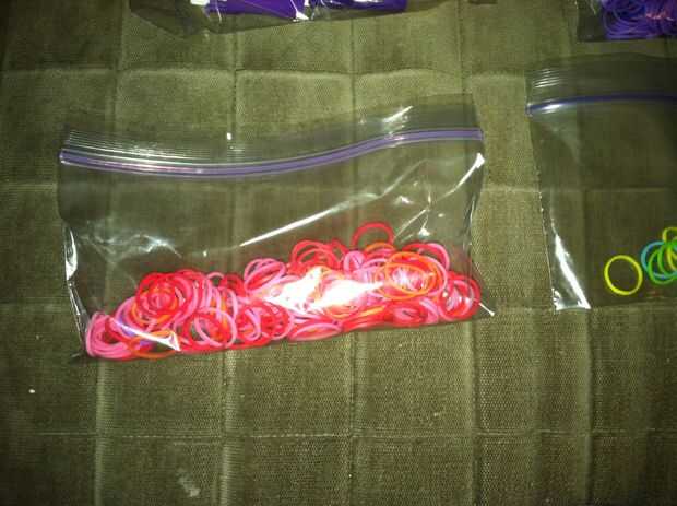 Comienzo poniendo las diferentes bandas de color en un bolso para cada color y luego poner todas tus pulseras y ganchos más diferentes artilugios en diferentes bolsas