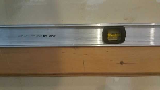 Subir la pared, colocar una tira cada 12-16" verticalmente. puede ayudar a hacer un estante como se describe en el siguiente paso y use el estante para mantener su caja de tornillos y taladre como se mueve para arriba, simplemente puede mover la plataforma.