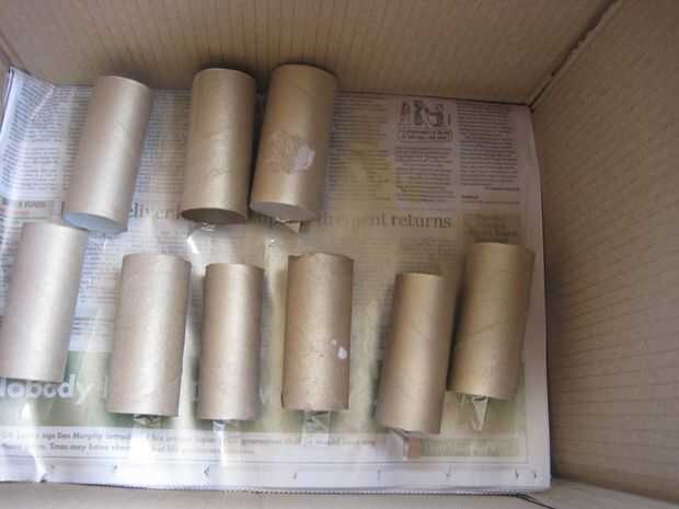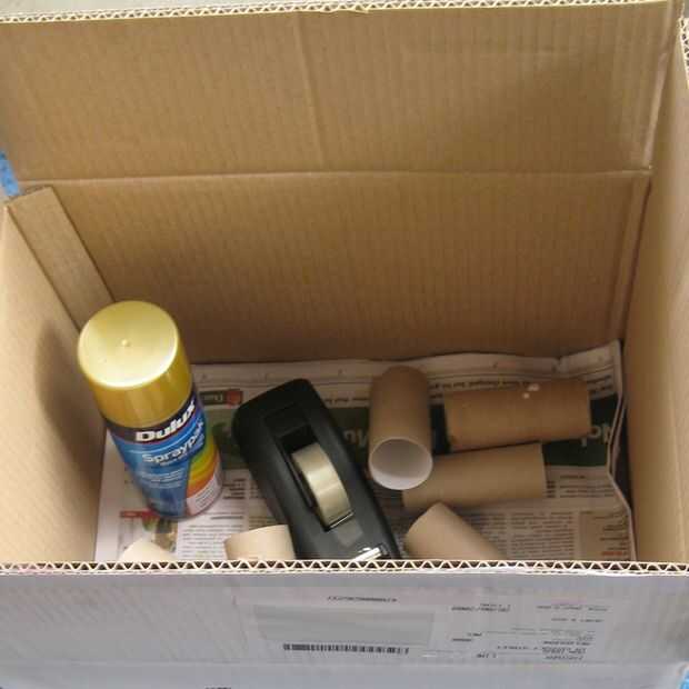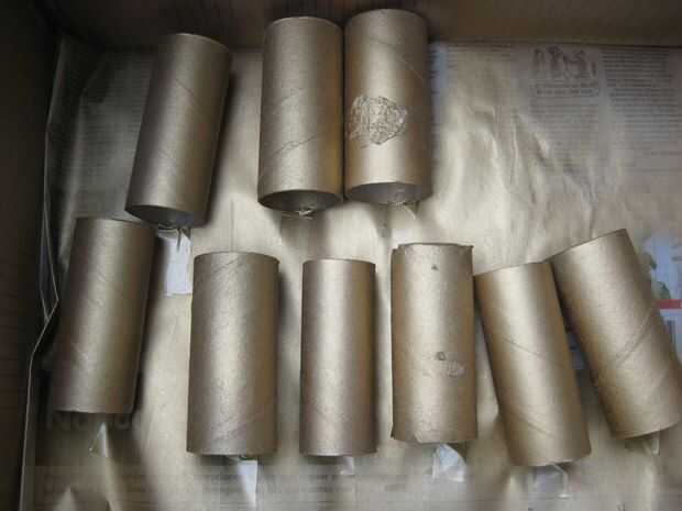 decidí pintar los cilindros delanteros con pintura en aerosol oro. Porque estaba preocupado por rociado encontré una caja y poner los cilindros de cartón en él. Para mantener en su lugar yo pegada a la parte inferior. Una capa no fue suficiente, dos fue mejor pero no sé si valió la pena.