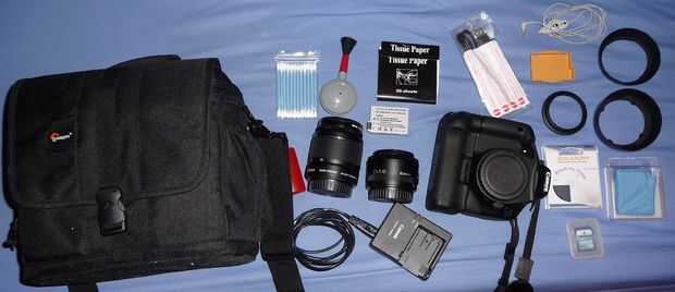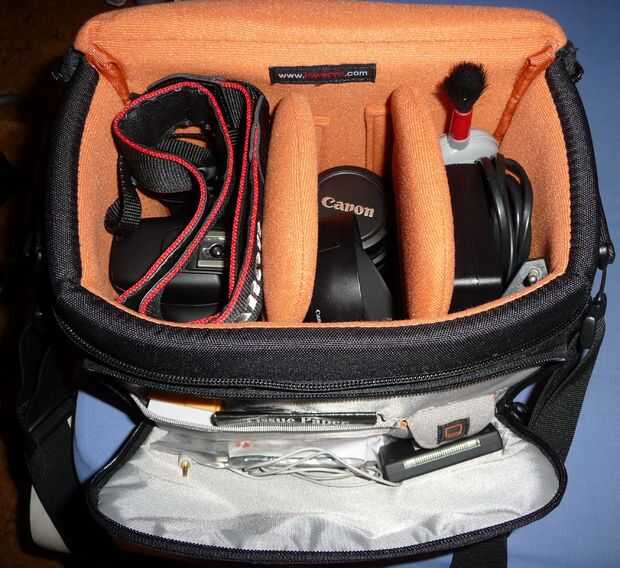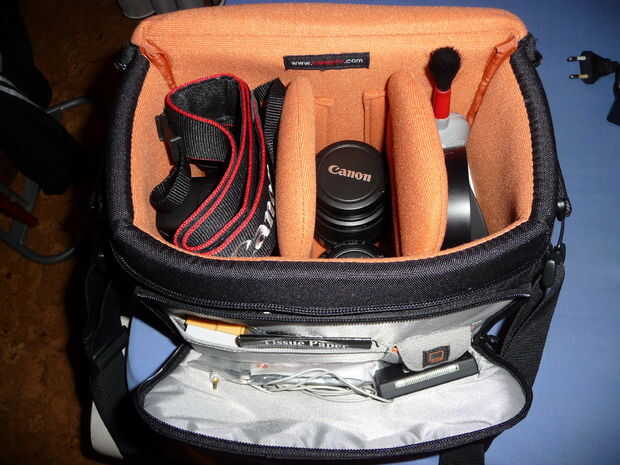Mi equipo: Canon EOS 550D (o T2i / Kiss X4 dependiendo de tu país) con empuñadura BG-E8, es Canon EF-S 18-55 mm f/3.5-5.6 II, Canon EF 50 mm f/1.8 II, campanas, 2 filtros, una batería de recambio, una tarjeta SD de copia de seguridad, cosas de limpieza, un disparador de bricolaje, cables USB y un cargador de la lente. Eso es un montón de cosas, comentarios dicen que es más que la capacidad de la bolsa, y básicamente están en lo cierto, pero con algunos experimentando puede encontrar un lugar para todo.