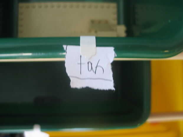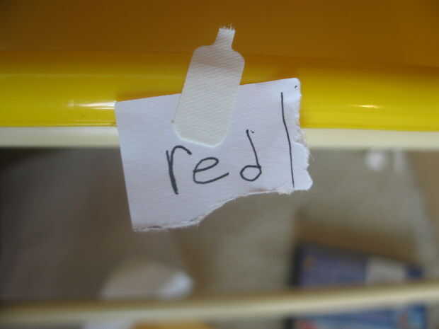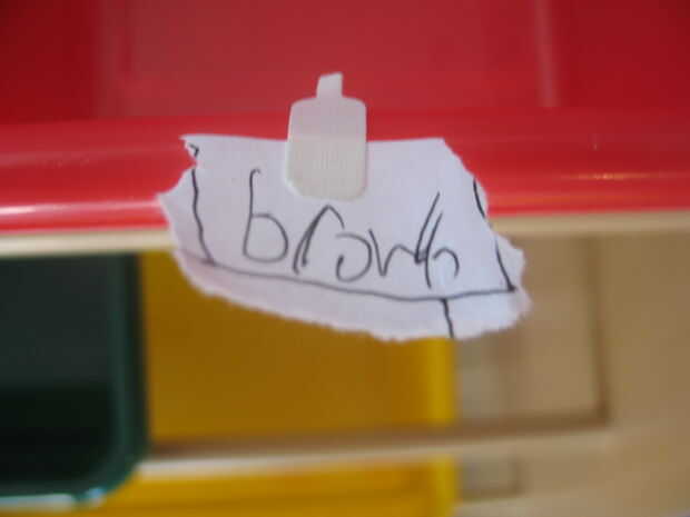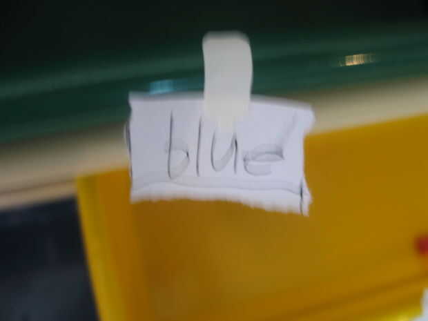 Antes de empezar a organizarlas necesita etiquetar tus cubos para asegurarse de que usted sabe cuál es cuál. mi letra es atroz, pero sólo porque estaba en un gran apuro. Etiquetas por color y también pequeñas piezas como "Postes" fueron etiquetados. El otro cubo de colores eran para nada fuera de lo común.