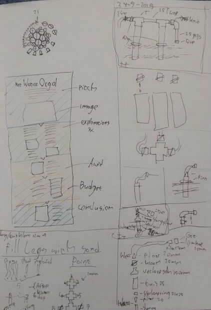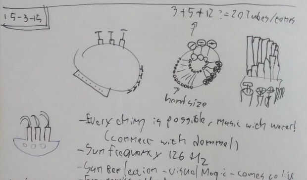 Como cualquier proyecto, comencé a pensar duro, dibujando mucho y discutir las ideas. A través de enormes estructuras atronadores, secuenciadores de la físicas, teniendo en cuenta finalmente llegó a este plan: una estructura con muchos tubos de órgano, todos atentos a la tonalidad de C ("la escala del sol") y muchos mecanismos diferentes para jugar.