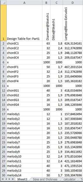 Lo cool de SolidWorks es que puede vincular un modelo y una hoja de Excel a través de la "mesa". Hay algunas cosas a tener en cuenta, consultando estos enlaces que usted encontrará todo lo que necesitas saber para afinar las tuberías: