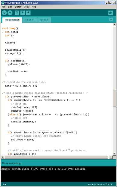 En este paso explicaré el software que se ejecuta en el controlador Arduino. La fuente está disponible f los dos archivos principales son el mouseorgan.ino y mouse1.ino el archivo mouse1.ino se encarga de la comunicación con el ratón PS/2. Tiene una configuración de la función llamada ps2_setup() y dos funciones de utilidad. ps2hostpoll() se encarga de enviar comandos a los mangos de ratón y mousepoll() recepción y decodificación de los datos desde el ratón. Al final tienes tres variables; - mx que rastrea el X la posición del ratón y mi que rastrea la posición Y del ratón. La variable mswitches tiene el estado de encendido de los tres botones como los bits de la parte inferior tres. La imagen de esta página muestra la parte principal del lazo de software. Este pequeño pedazo de código utiliza el valor de X y el estado de los botones del ratón para decidir qué nota dar y cuándo enviar la nota de comando. También reajustará los valores X e Y cuando se presiona el botón del medio.