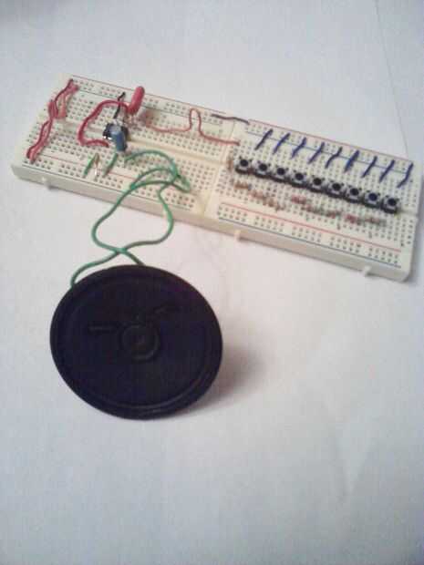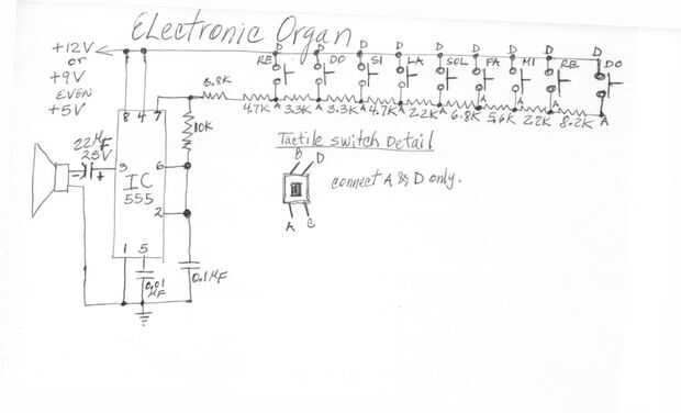 este proyecto se basa en el circuito de temporizador IC555 que es capaz de proporcionar el conjunto de notas musicales:, RE, MI,... Y con la ayuda de algunos componentes y dispositivos esenciales, se puede hacer el proyecto. El circuito es básicamente un oscilador constituido un circuito integrado 555 y algunos diferentes valores de resistencia para generar una señal de salida con diferentes frecuencias. En Resumen, montar este proyecto, se obtiene un circuito genera notas musicales. El órgano electrónico es un instrumento musical que puede trabajar con 12V o 9V hasta 5 voltios es suficiente para desarrollar su trabajo. A continuación, puede utilizar una batería de 9V.