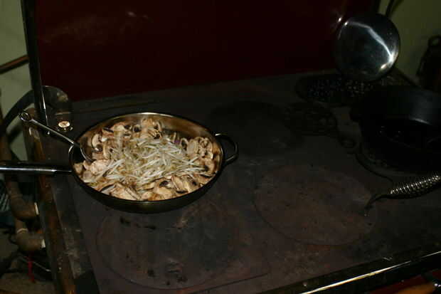 Derrita la mantequilla a fuego medio y añadir la cebolla y el ajo cocinan 2 minutos. Añadir brotes de soja, después de unos minutos agregue la mitad de las setas. Deje que el ' srooms cocinar abajo el resto.