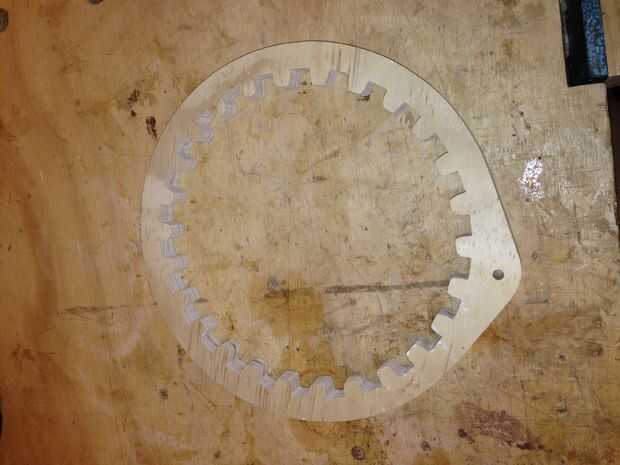 El engranaje de anillo de acabado debe parecerse a esto. El "bump" es donde drll un agujero de 1/4 y montar su manivela.