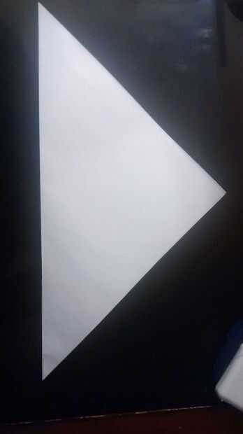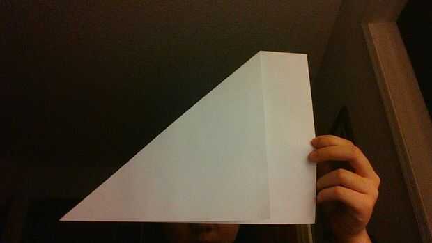 Bueno, sé que esto suena de paso como un montón de pasos, pero en realidad no es. Ver la primera foto, doblar el borde es simétricamente resuelve al final. Cortar el rectángulo extra para conseguir el triángulo en la segunda foto. Doblar el triángulo simétricamente y desdoblar para obtener la línea de en medio.