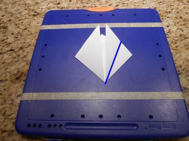 se necesita:-tijeras-una hoja de origami de 15cmx15cmPaso 1: Base Doblar las diagonales. Pellizcar el papel y doblar las esquinas dentro.Paso 2: Cuerpo de la mariposa Doblar la parte superior un poco sobre el borde. Dé vuelta. Abrir la tapa superior