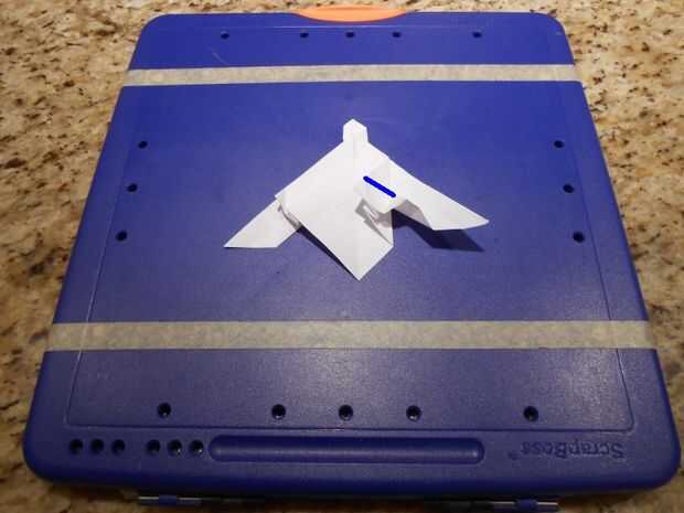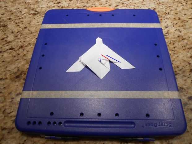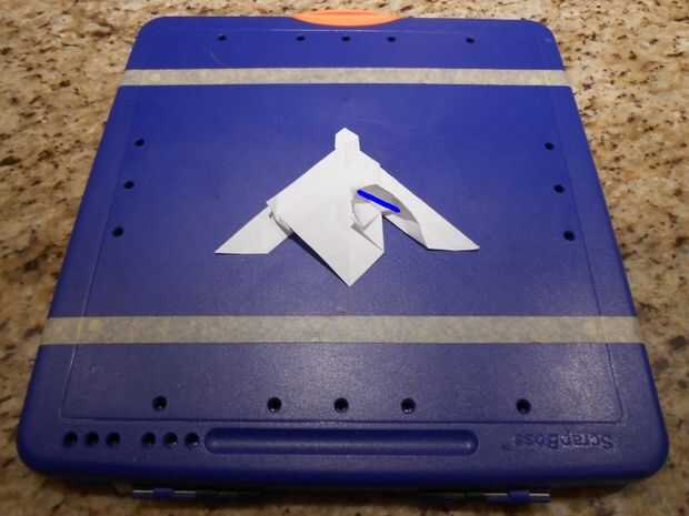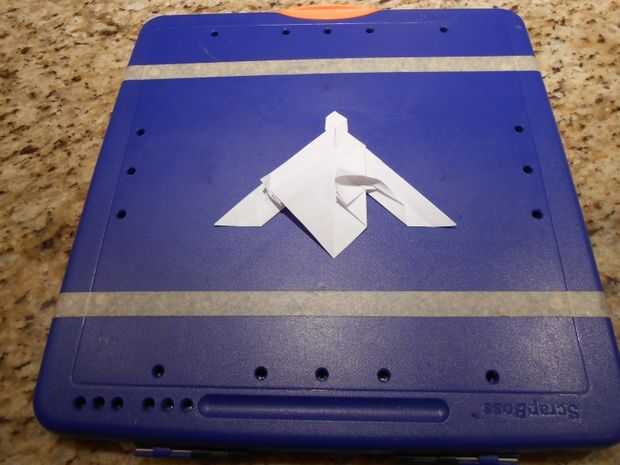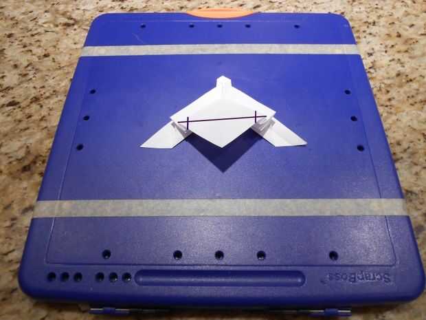 En el cuadro 2, dibujar la esquina derecha para que el pliegue vertical esté alineado con el pliegue vertical hacia abajo en el centro de la sección cuadrada. Esto hará que el papel de contorsionarse. Formar un pliegue de donde el pliegue vertical con el borde diagonal a donde naturalmente pone en el papel.