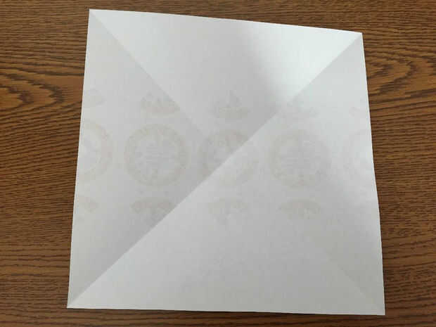 Comience con el lado blanco hacia arriba. Valle dobla el papel diagonalmente y desdoblar. Repita en ambas direcciones.