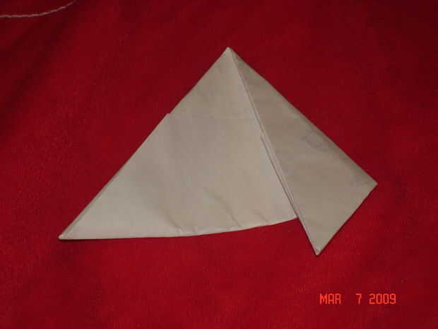 este es una clásica, de la arquitectura asiática la pagoda.  Este es un origami apilable.  Pila tan alta como quieras ~1. Comience con una pieza cuadrada de papel y doblar diagonalmente dos veces.2. Coloque las dos esquinas y pliegue para crear un tr