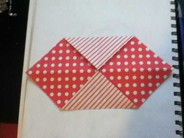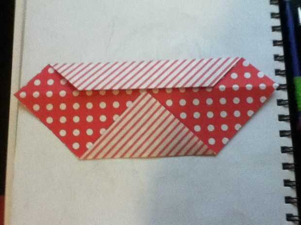 Doblar la parte superior e inferior en el centro. Arruga bien. Ahora dobla la parte superior para conocer en el medio. Pliegues bien y desplegar plenamente.
