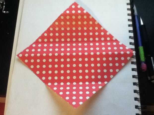 instruccionesPaso 1: Empezar con un papel de origami cuadrado de 6 pulgadas x 6 pulgadas (15 cm x 15 cm), color de lado hacia abajo.dobla el papel por la mitad en tanto eje diagonal. pliegues bien y despliegue.Paso 2: Doble las 4 esquinas hacia el ce