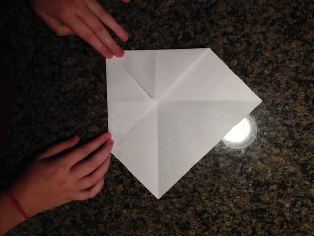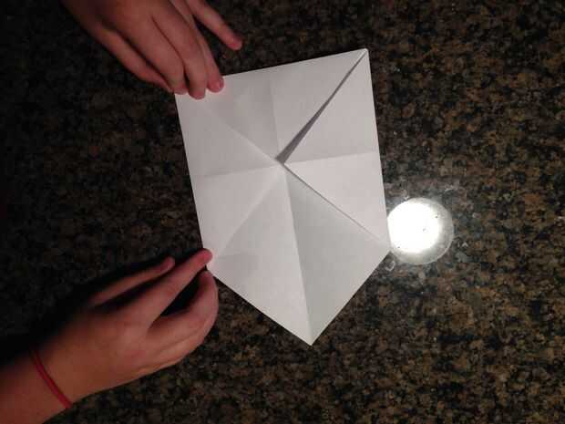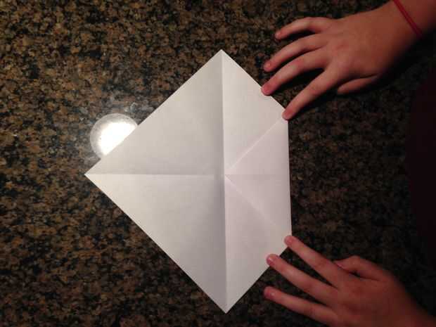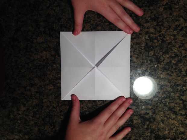 Tomar los bordes de rincón de la Plaza y comienzo plegándolas hacia adentro para que los puntos se encuentran en el centro del doblez del signo más.