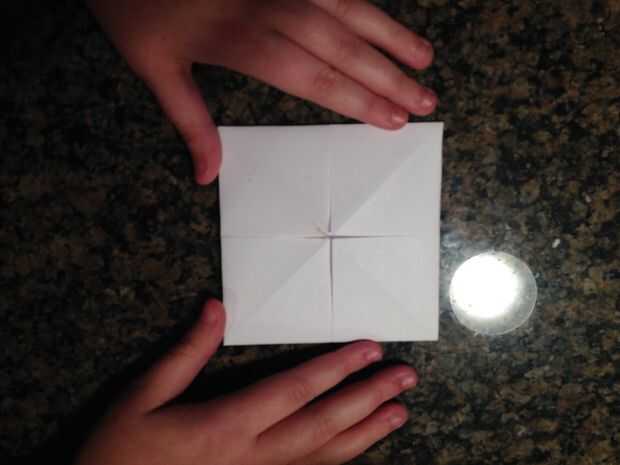 necesita una hoja de papel cuadradaPaso 1: Doble el papel en un triánguloPaso 2: Doblar también el otro lado en un triánguloPaso 3: Terminará con un pliegue de x en su papel.Paso 4: Doblar las cuatro esquinas en el centro.Paso 5: Terminaras como esta