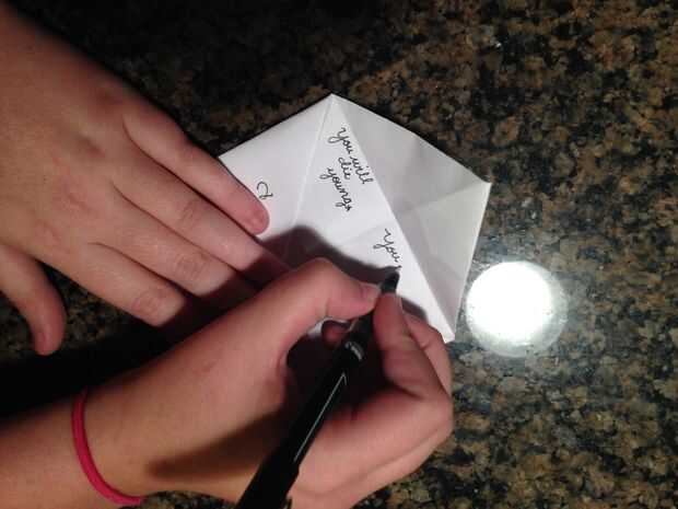 Abrir las secciones dobladas y escribir una fortuna debajo de cada sección. Recuerda que tienes 8 secciones, aunque 2 secciones compartan una aleta. Asegúrese de que permita que los pliegues del papel determinar la sección que está escribiendo de modo que una fortuna para un número no fluya en la fortuna de otro número.