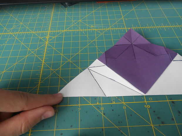 Doblar la punta del triángulo grande a la línea central. Asegúrese de que el doblez está también en el borde del triángulo pequeño.