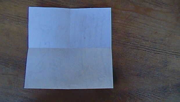 Comenzar con una pieza cuadrada de papel con el lado blanco hacia arriba. Ahora doblar en la mitad, de izquierda a derecha y desdoblar para hacer un pliegue. Hacer lo mismo, solamente la tapa inferior, pliegue y despliegue. Ahora debe tener una cruz.