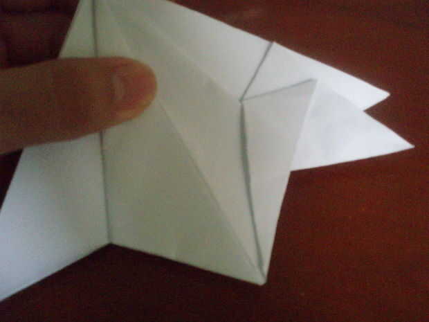 se necesita:-tijeras-una hoja de origami de 15cmx15cmPaso 1: Base Doblar las diagonales. Pellizcar el papel y doblar las esquinas dentro.Paso 2: Cuerpo de la mariposa Doblar la parte superior un poco sobre el borde. Dé vuelta. Abrir la tapa superior