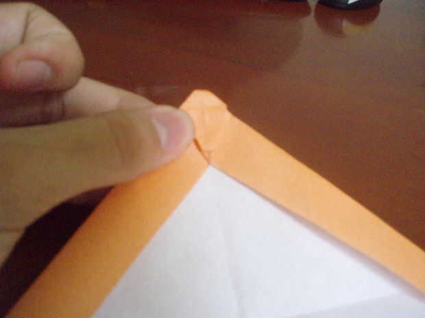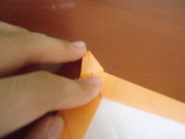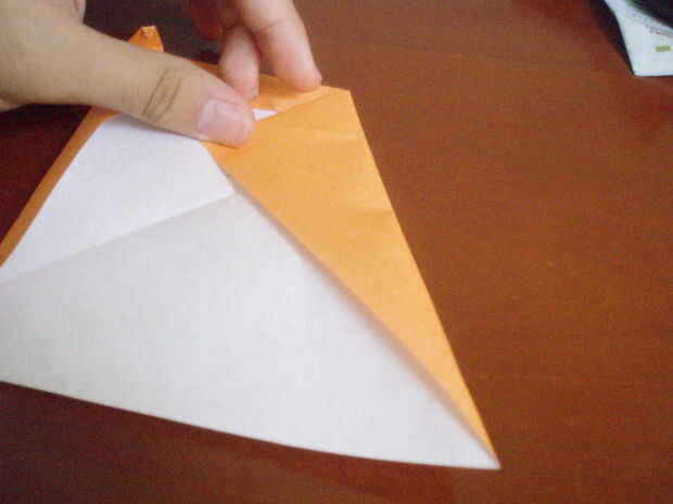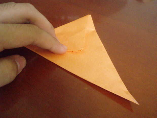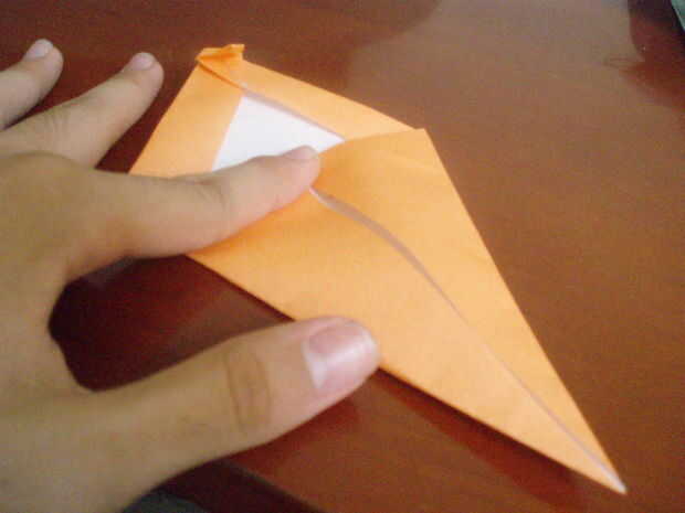 Fold up the preliminary base. Por lo que es parece una base pájaro medio terminar. Doble hacia abajo. Fregadero doble la punta del mismo (un poco, no mucho). Doble para arriba otra vez. Doble hacia abajo la punta de él otra vez. El doblez lateral a la línea central (por lo que parece un cometa). Doble hacia abajo la 'cabeza' exactamente como la línea que es creada por los dos lados doblados. Abra los dos lados, mantener la 'cabeza' doblada hacia abajo.