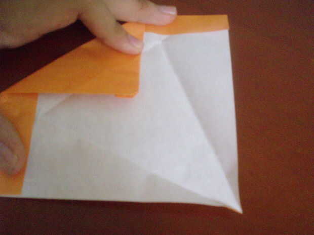 se necesita:-tijeras-una hoja de origami de 15cmx15cmPaso 1: Base Doblar las diagonales. Pellizcar el papel y doblar las esquinas dentro.Paso 2: Cuerpo de la mariposa Doblar la parte superior un poco sobre el borde. Dé vuelta. Abrir la tapa superior