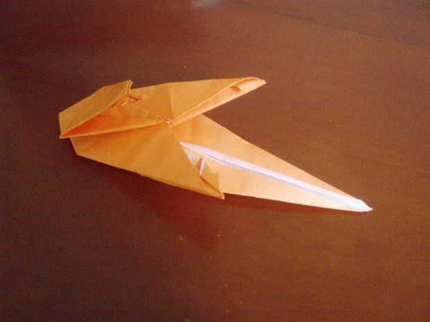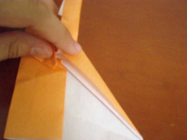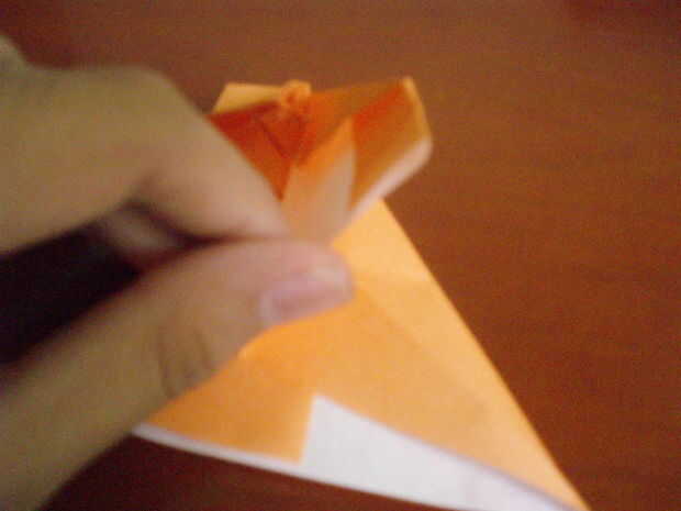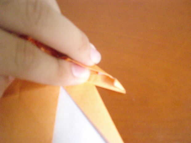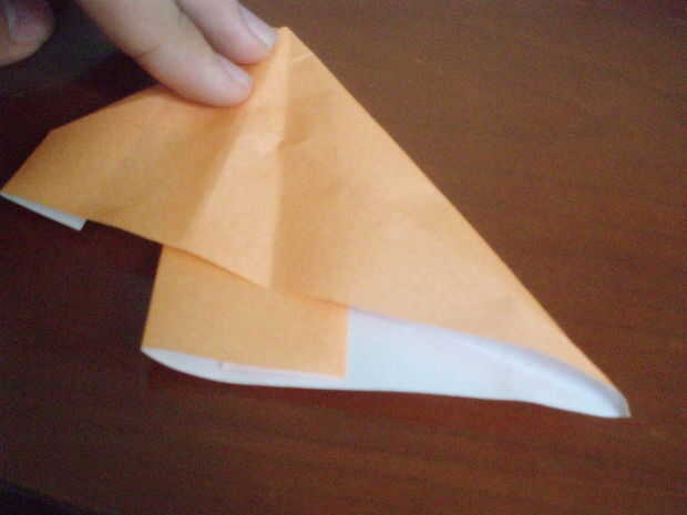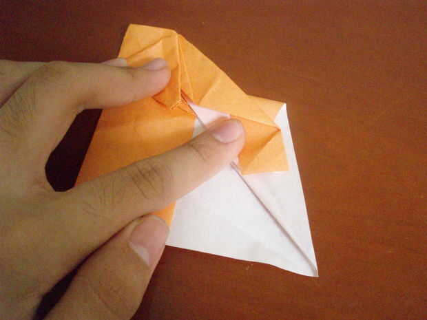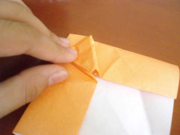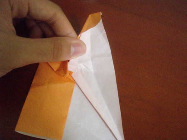 Valley fold the left side. Luego doblar por la mitad. La montaña inversa doble. Luego doblar el brazo, pliegue hacia abajo de la capa de abajo. Doble hacia abajo el brazo. Abra la capa superior. 'Insertar' la capa de la punta en él. Repita en el otro lado.