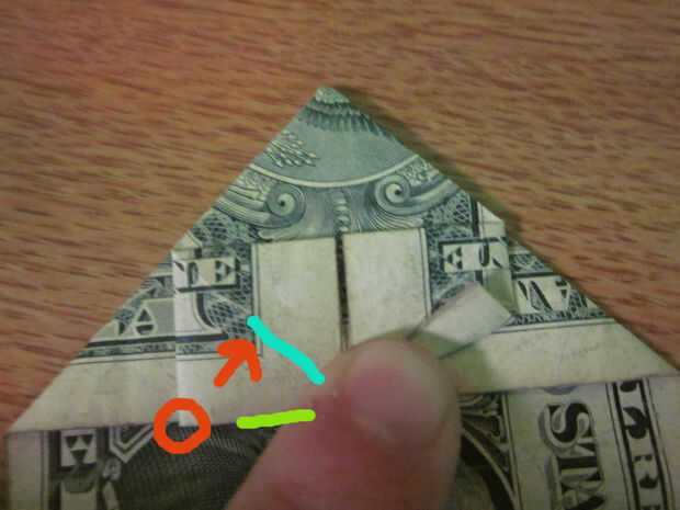 Hagamos más triángulos! (como si no fueras de geometría y los pequeños pliegues por ahora...) Tomar las 2 esquinas libres (ejemplo en círculo rojo) de cada uno de sus 4 plazas y doblar en alineación (ejemplo de la línea verde) con la línea central (ejemplo de la línea azul) en su plaza. Debe crear 8 triángulos de sus 4 plazas. La segunda imagen es un ejemplo de lo que uno de los lados de tu billete de un dólar debe cuidar como los pliegues.