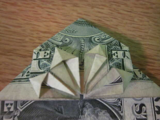 Aquí es donde se pone un poco complicado. Quiere meter el dedo en el triángulo hasta que ha abierto un poco, lo suficiente como para empujar la parte superior (en el ejemplo del círculo rojo) del triángulo. Similar al método que hemos utilizado de vuelta los 4 cuadrados en 8 triángulos excepto sólo es doblar la punta. Se pueden ver en la primera imagen mi dedo empuja la tapa hacia abajo para crear aún más pequeño, otro triángulo. La segunda imagen muestra lo que debe. Hacer esto para todos 8 triángulos.