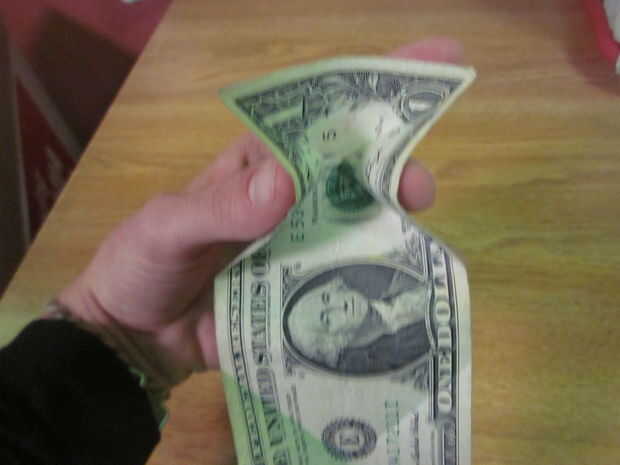Ahora quiere tomar el billete de un dólar y pellizque los lados superiores donde han creado el X en su cuenta (en ambos extremos). Apriete como se muestra en la imagen.